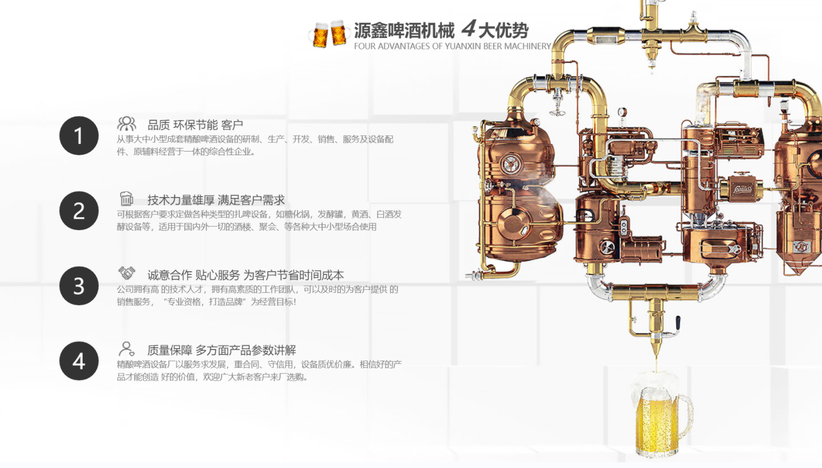 南陽市源鑫啤酒機械設(shè)備有限公司位于歷史文化名城一-南陽,從事大中小型成套啤酒、白酒自釀設(shè)備的研制、生產(chǎn)、開發(fā)、銷售、服務(wù)及設(shè)備配件、原輔料經(jīng)營于一體的綜合性企業(yè)。公司可根據(jù)客戶要求定做各種類型的扎啤設(shè)備,如糖化鍋,發(fā)酵罐,黃酒、白酒發(fā)酵設(shè)備等,適用于國內(nèi)外一切的酒樓、餐廳、家庭.聚會、酒吧等各種大、中、小型場合使用。公司擁有技術(shù)人才,擁有高素質(zhì)的工作團隊,可以及時的為客戶提供**的銷售服務(wù)。公司以“專業(yè)資格,打造品牌”為經(jīng)營目標,“卓越質(zhì)量,信賴價格”為經(jīng)營宗旨,以質(zhì)量求生存,以服務(wù)求發(fā)展,重合同、守信用,設(shè)備質(zhì)優(yōu)價廉。相信好的產(chǎn)品才能創(chuàng)造 好的價值,歡迎廣大新老客戶來廠選購。...